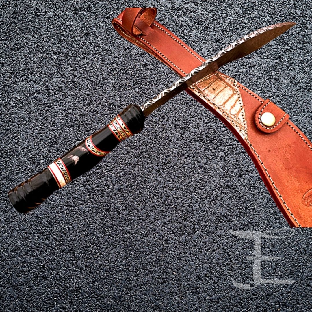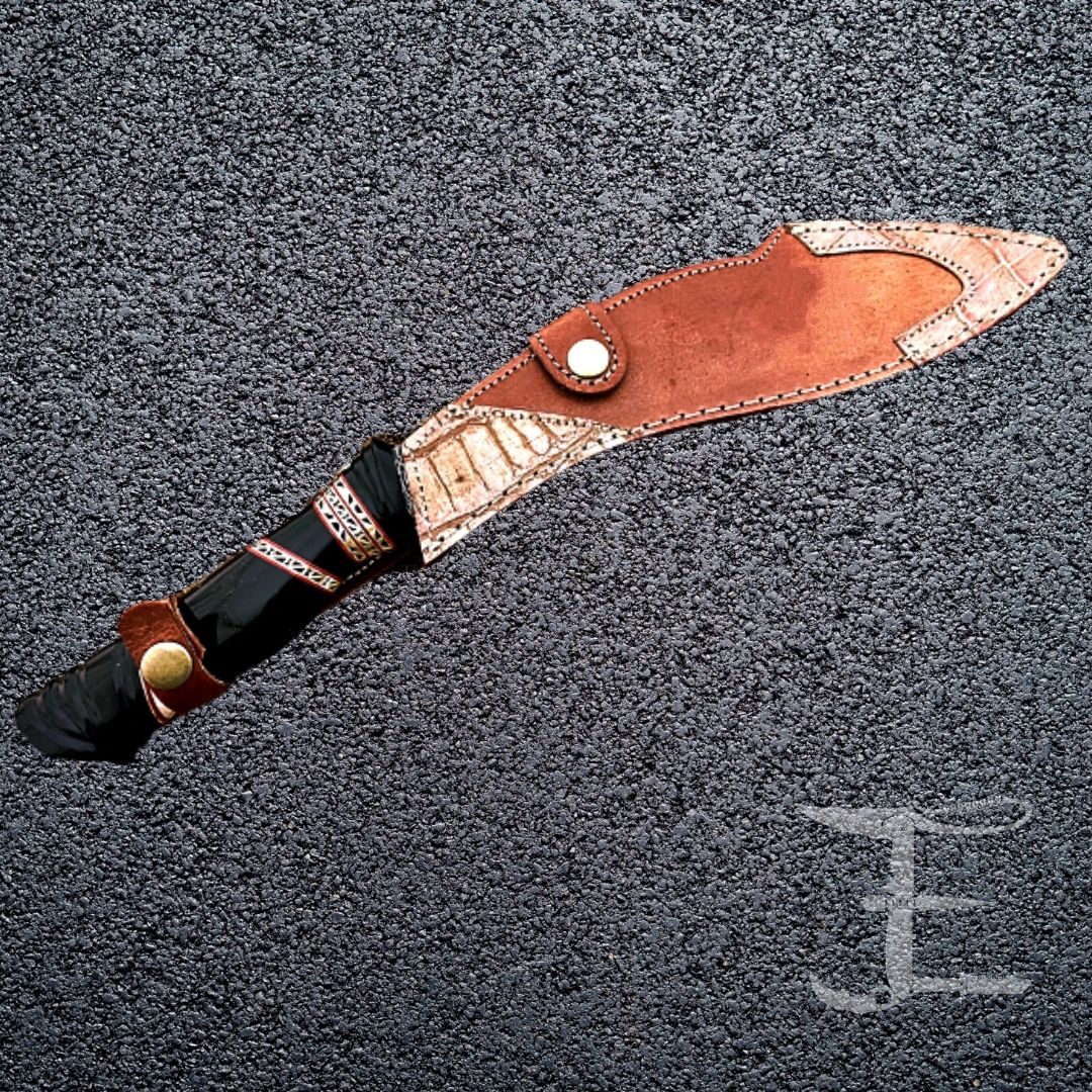 This knife looks nice in the pouch. The knife comes with a 100% authentic Fine Quality Extra Thick Bull Hide Leather Utility sheath. The leather sheath is woven and sewn entirely by hand. It is possible to use the sheath on the belt.