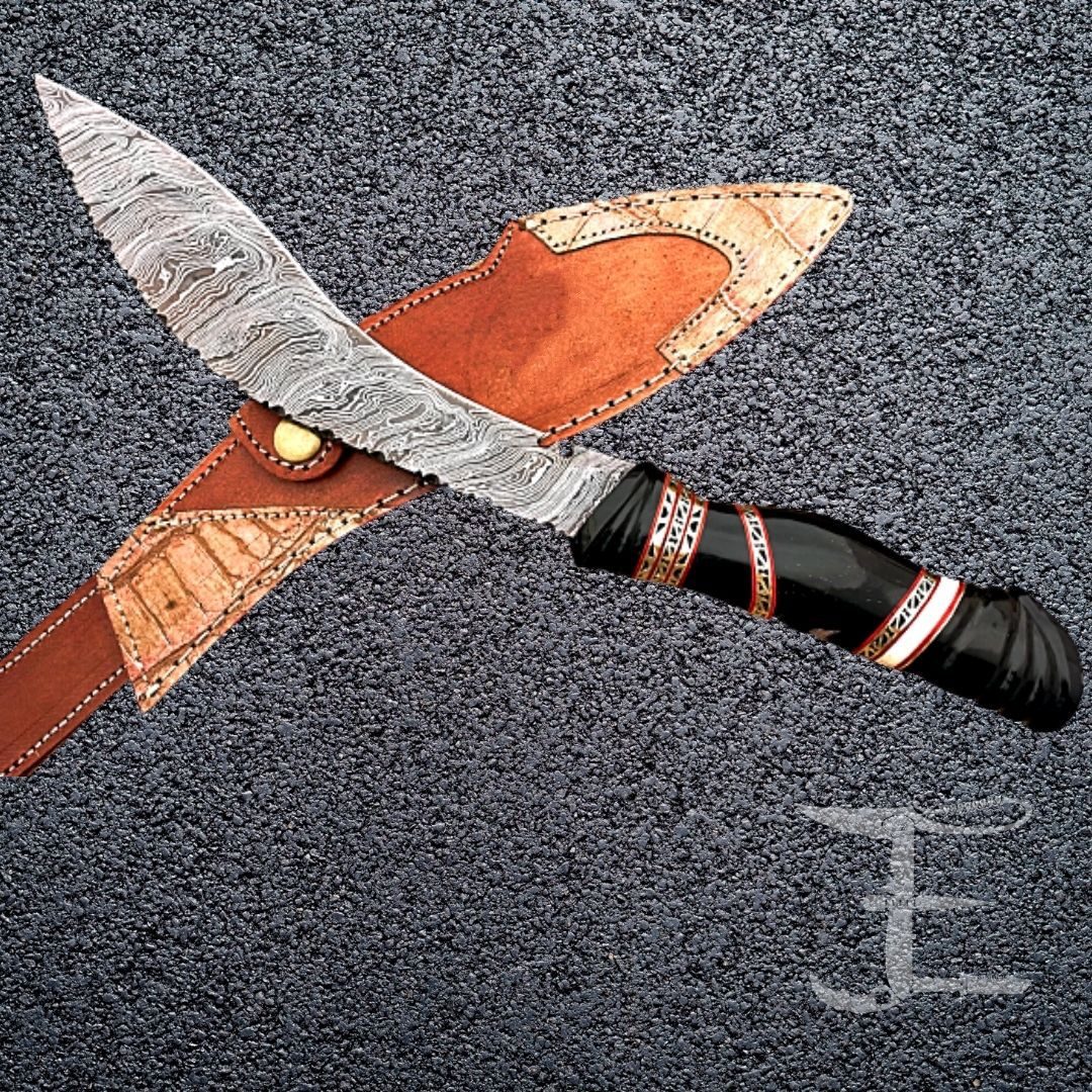 JAKEN Brand New Custom Handmade Damascus 15 inches Long Full-Tang Buffalo Horn Round scale Hunting Camping Kukri Knife