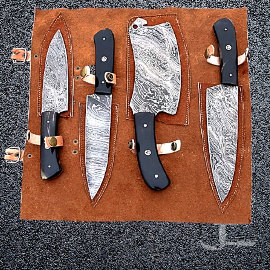 JAKEN Brand New Custom Handmade Twist Pattern Forged Damascus 4 Pcs Full-Tang Buffalo Horn Handle Hunting Camping Outdoor Kitchen Knife Set